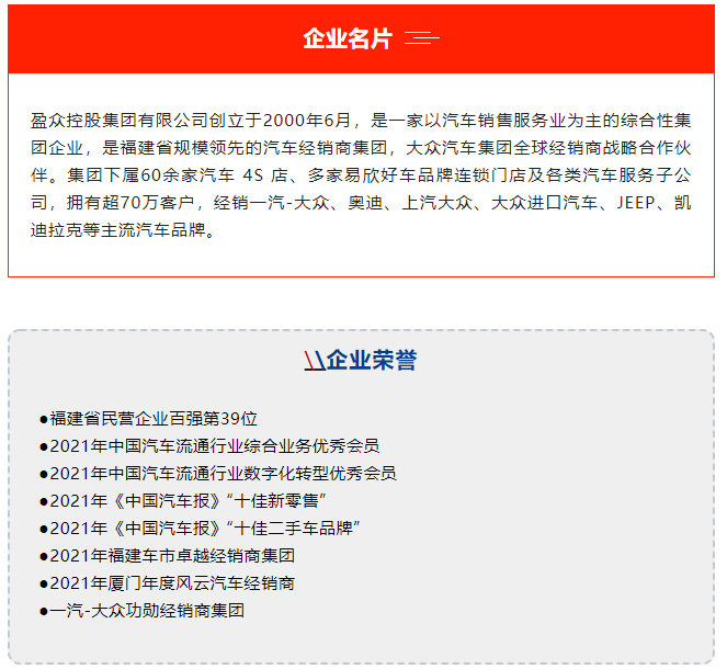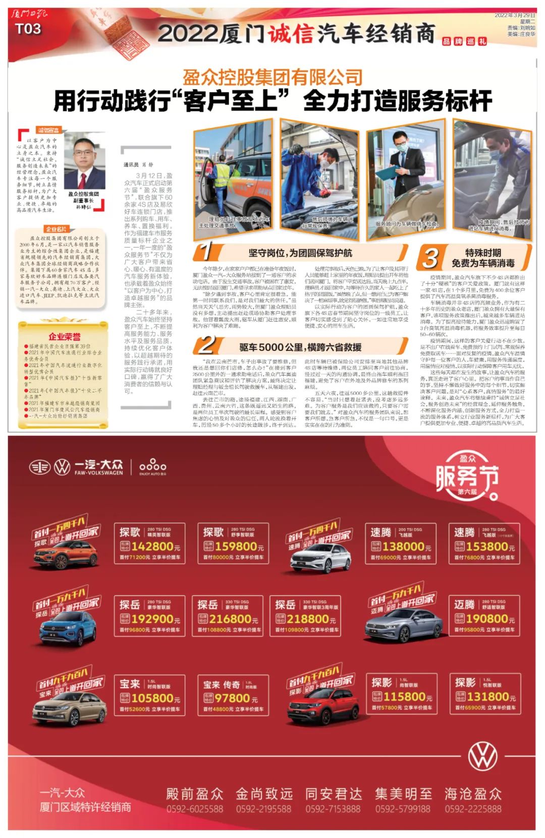 3月12日,盈眾汽車正式啟動第六屆“盈眾服務(wù)節(jié)”,聯(lián)合旗下60余家4S店及易欣好車連鎖門店,推出系列購車、用車、養(yǎng)車、置換福利。作為福建車市服務(wù)質(zhì)量標(biāo)桿企業(yè)之一,一年一度的“盈眾服務(wù)節(jié)”不僅為廣大客戶帶來省心、暖心、有溫度的汽車服務(wù)新體驗,也承載著盈眾始終“以客戶為中心,打造卓越服務(wù)”的品牌主張。