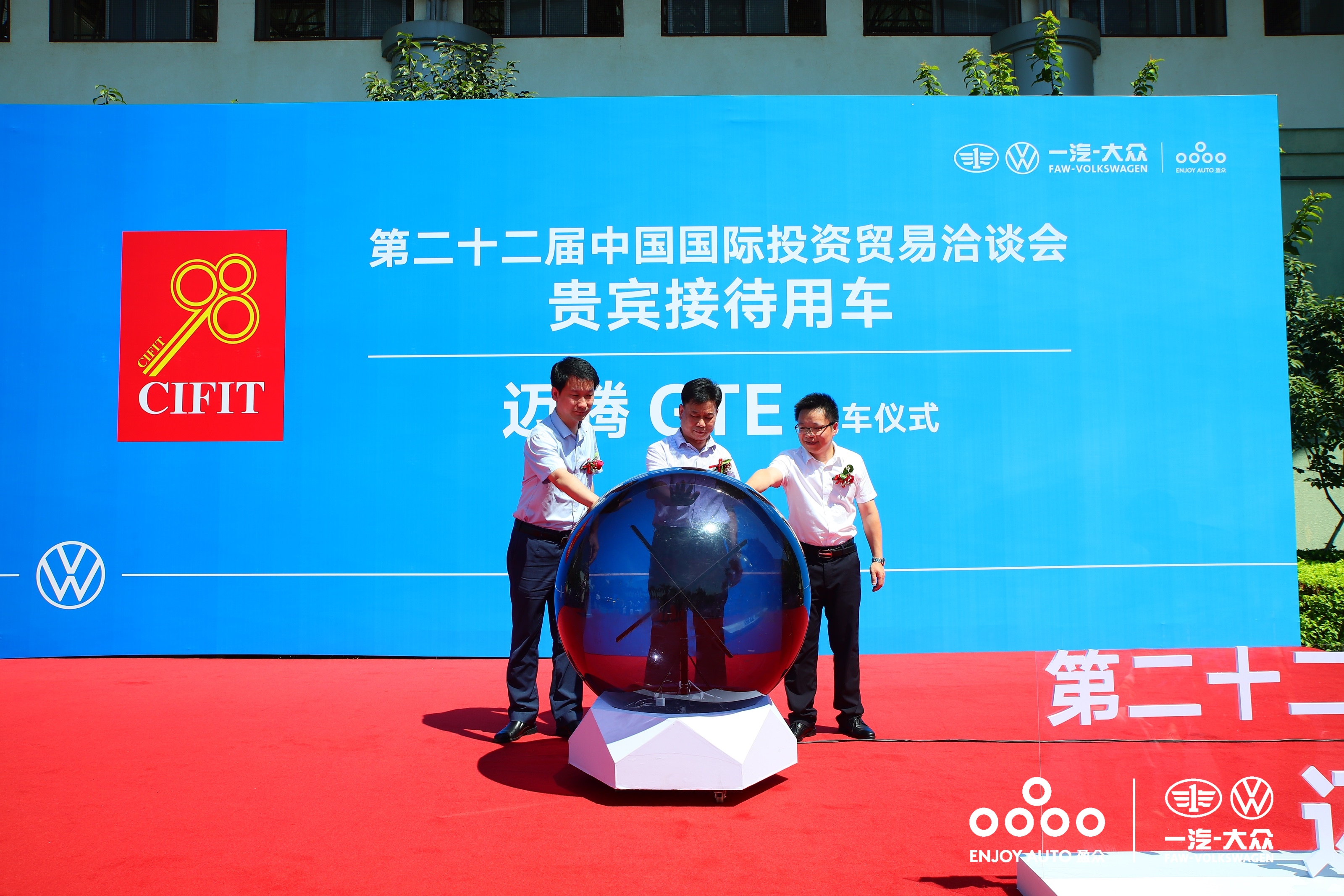 交車儀式上,廈門市機關(guān)事務(wù)管理局副局長鄭端文(中)、一汽-大眾福建區(qū)域主管銷售經(jīng)理曲慧博(左)、盈眾控股集團常務(wù)副總裁易遠航(右)共同上臺點亮一汽-大眾邁騰GTE對第二十二屆中國國際投資貿(mào)易洽談會的保駕護航之旅。