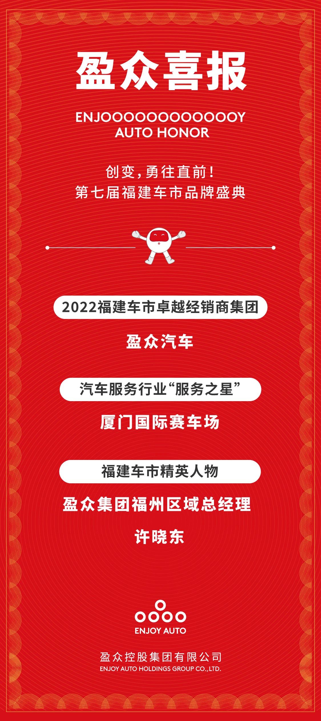 通過媒體聯(lián)盟專業(yè)票選、全省公眾問卷調(diào)查、全民網(wǎng)絡(luò)投票等多個環(huán)節(jié)角逐,2022年福建車市最具人氣的品牌、經(jīng)銷商、車型、人物等榮譽獎項在現(xiàn)場揭曉。盈眾汽車再次蟬聯(lián)年度“