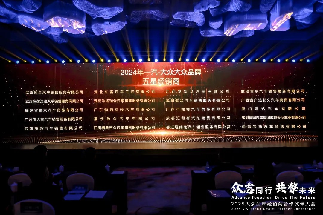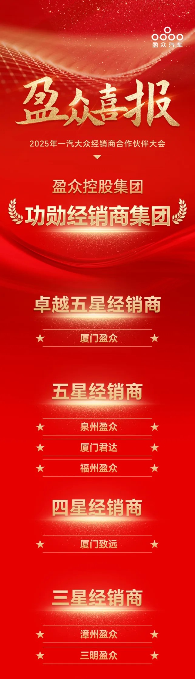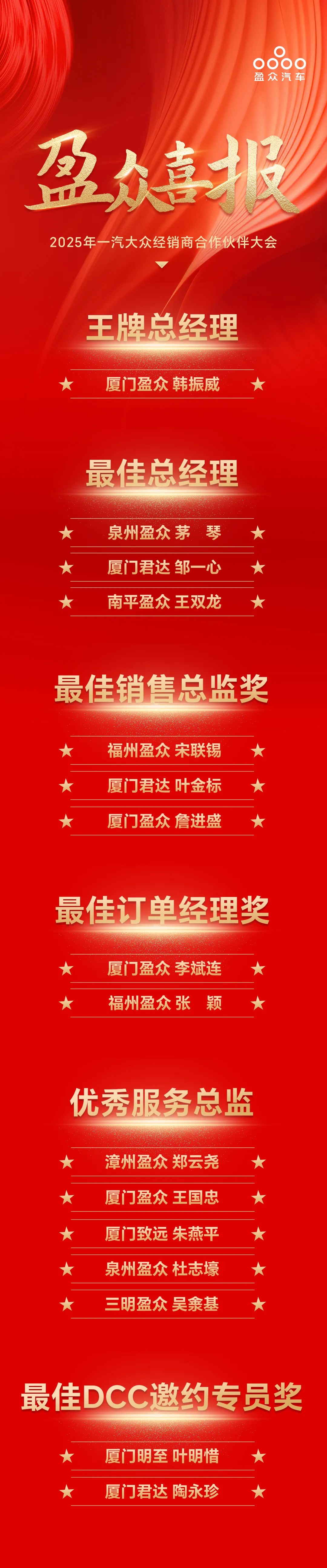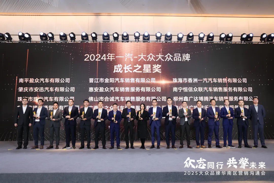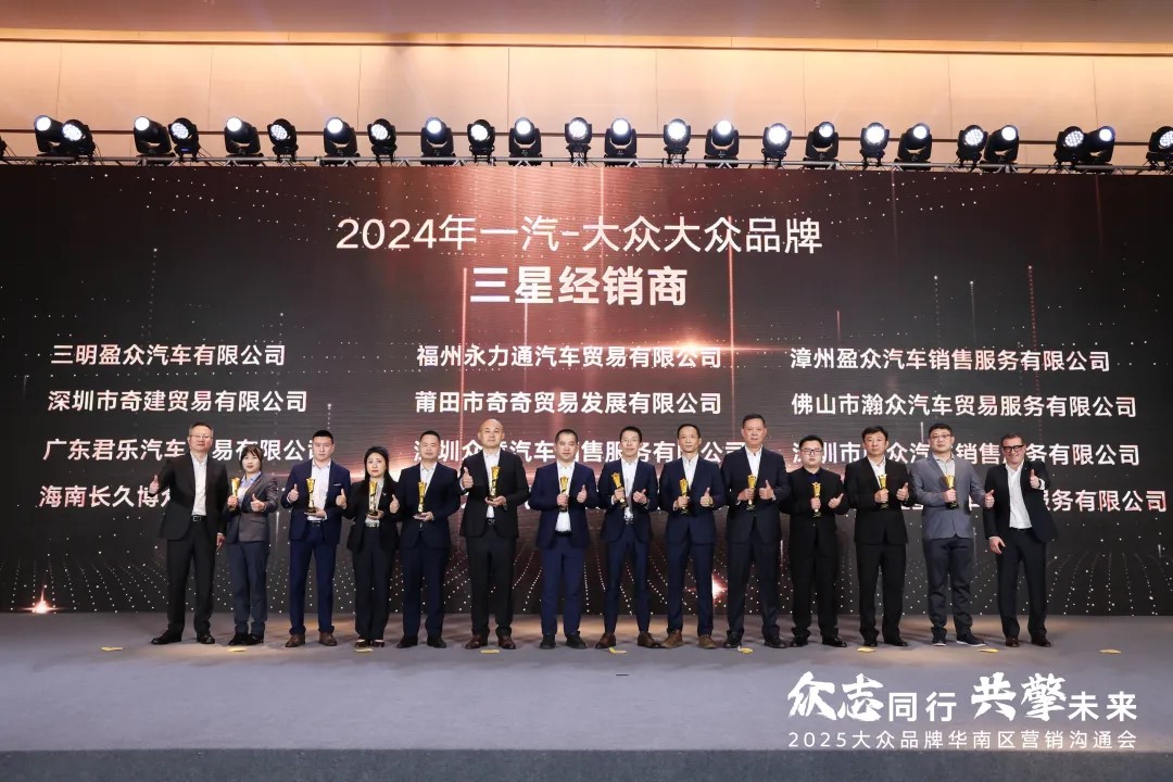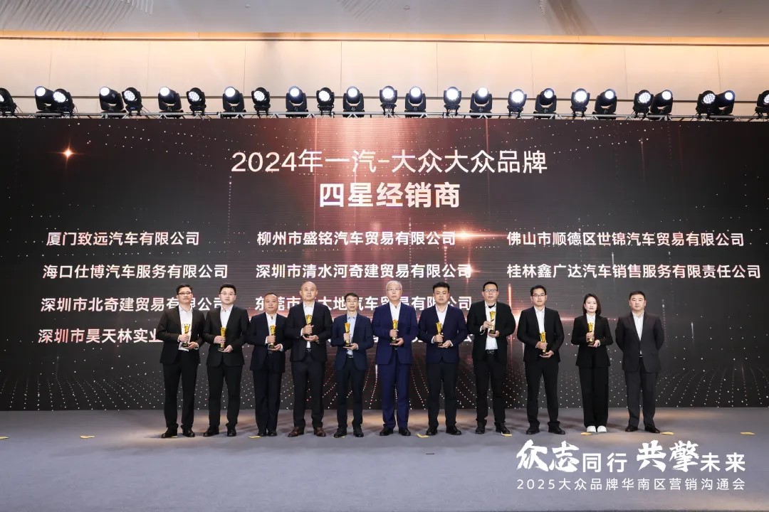 近日,2025大眾品牌經(jīng)銷商合作伙伴大會、一汽-大眾華南區(qū)經(jīng)銷商年會相繼召開,2024年度一汽-大眾優(yōu)秀經(jīng)銷商名單及個人獲獎名單新鮮出爐。盈眾一汽-大眾團隊憑借過硬的綜合實力及銷售業(yè)績、運營管理、客戶服務(wù)體驗等多維度的亮眼表現(xiàn),榮獲“功勛經(jīng)銷商集團”“卓越五星經(jīng)銷商”“五星經(jīng)銷商”“王牌總經(jīng)理”等系列獎項。