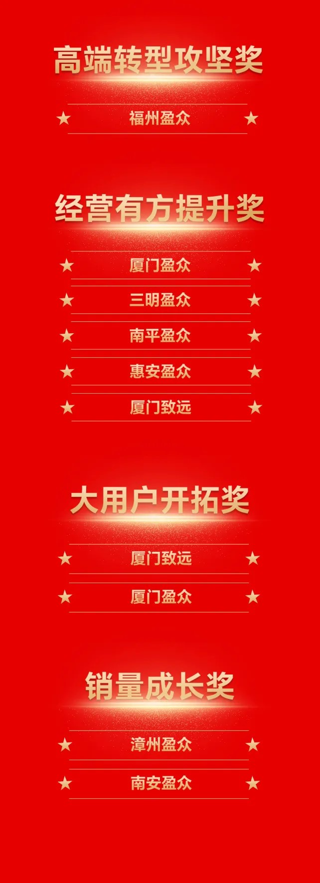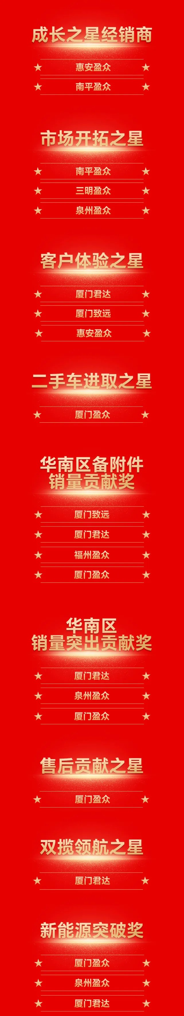 作為一汽-大眾標(biāo)桿經(jīng)銷商,廈門盈眾已連續(xù)16年獲得“五星經(jīng)銷商”榮譽稱號,今年,廈門盈眾更是成為華南區(qū)首家獲得“卓越5星經(jīng)銷商”的4S店。泉州盈眾、廈門君達、福州盈眾2024年持續(xù)發(fā)力、多點突破,入選“五星經(jīng)銷商”。廈門致遠秉持初心,腳踏實地,獲得“四星經(jīng)銷商”,漳州盈眾、三明盈眾也憑借不懈努力,入選“三星經(jīng)銷商”,惠安盈眾、南平盈眾獲得“成長之星經(jīng)銷商”。