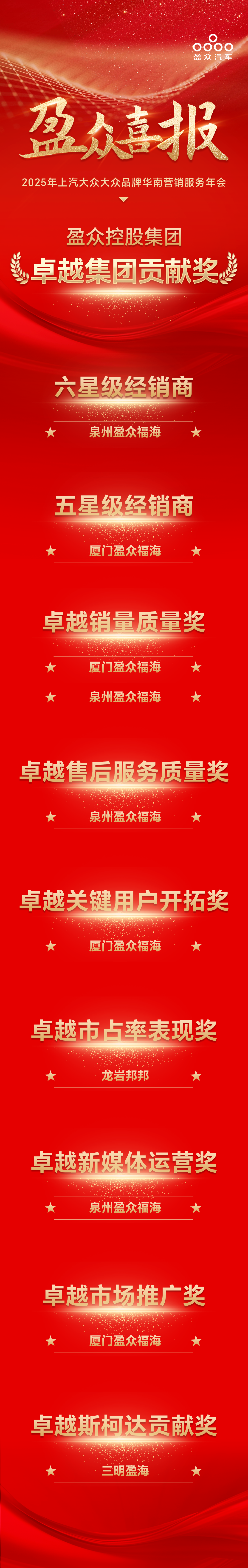 載譽而歸,碩果累累。每一份榮譽都凝聚著廣大客戶、合作伙伴的信任與支持,也見證了盈眾多年來深耕上汽大眾品牌的決心與積淀。在 2025 年新的征程中,盈眾將以此為新的起點,把榮譽轉(zhuǎn)化為前進的動力。秉持“用科技和文化,讓人們的汽車生活更美好” 的使命,不斷創(chuàng)新服務(wù)模式,提升服務(wù)品質(zhì),為客戶打造更加便捷、舒適、智能的汽車生活體驗,持續(xù)為上汽大眾品牌的發(fā)展貢獻力量,攜手共創(chuàng)更加輝煌的未來。